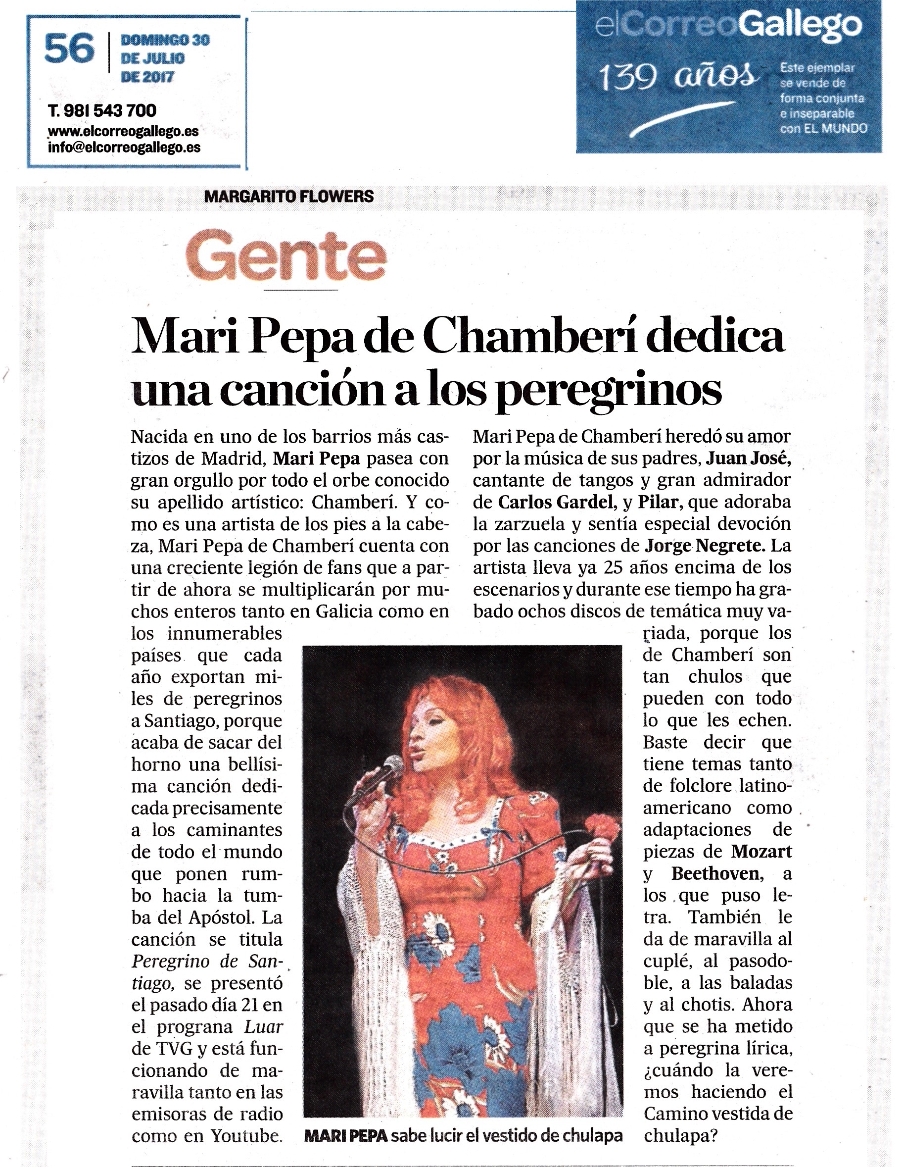 MARI PEPA presentó la canción “PEREGRINO DE SANTIAGO” en la Televisión de Galicia, en el programa LUAR, de la mano de Xosé Ramón Gayoso y Jose Luis Blanco, con una entrañable entrevista y la interpretación del tema de su autoría. Una canción con aires y ritmos gallegos dedicada a Santiago Apóstol y a los peregrinos.