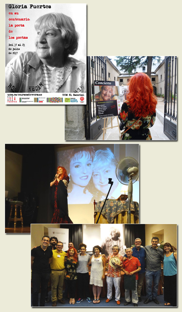 Maravillosa tarde en San Lorenzo del Escorial, dónde Mari Pepa actuó en una de las jornadas de los Cursos de Verano, que la Universidad Complutense de Madrid, dirigidos por Marcos Roca, ha dedicado a Gloria Fuertes, con motivo del centenario de su nacimiento.