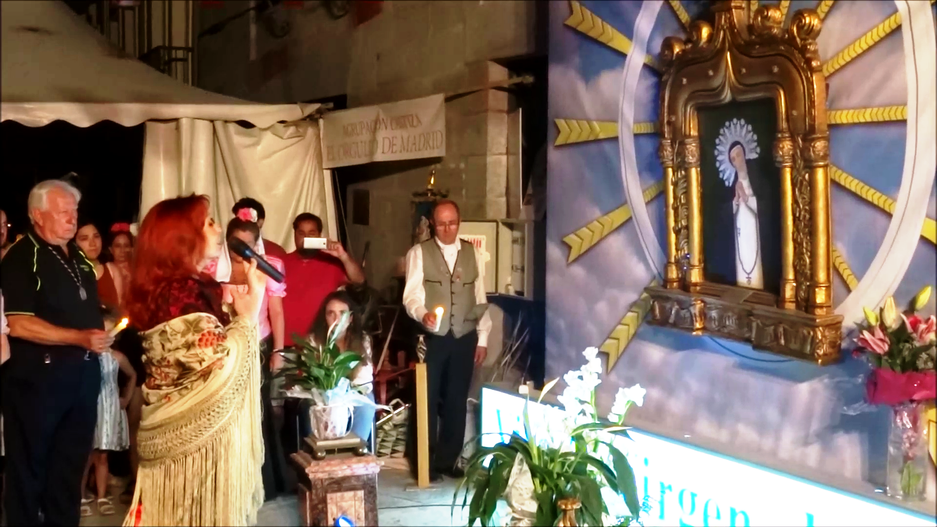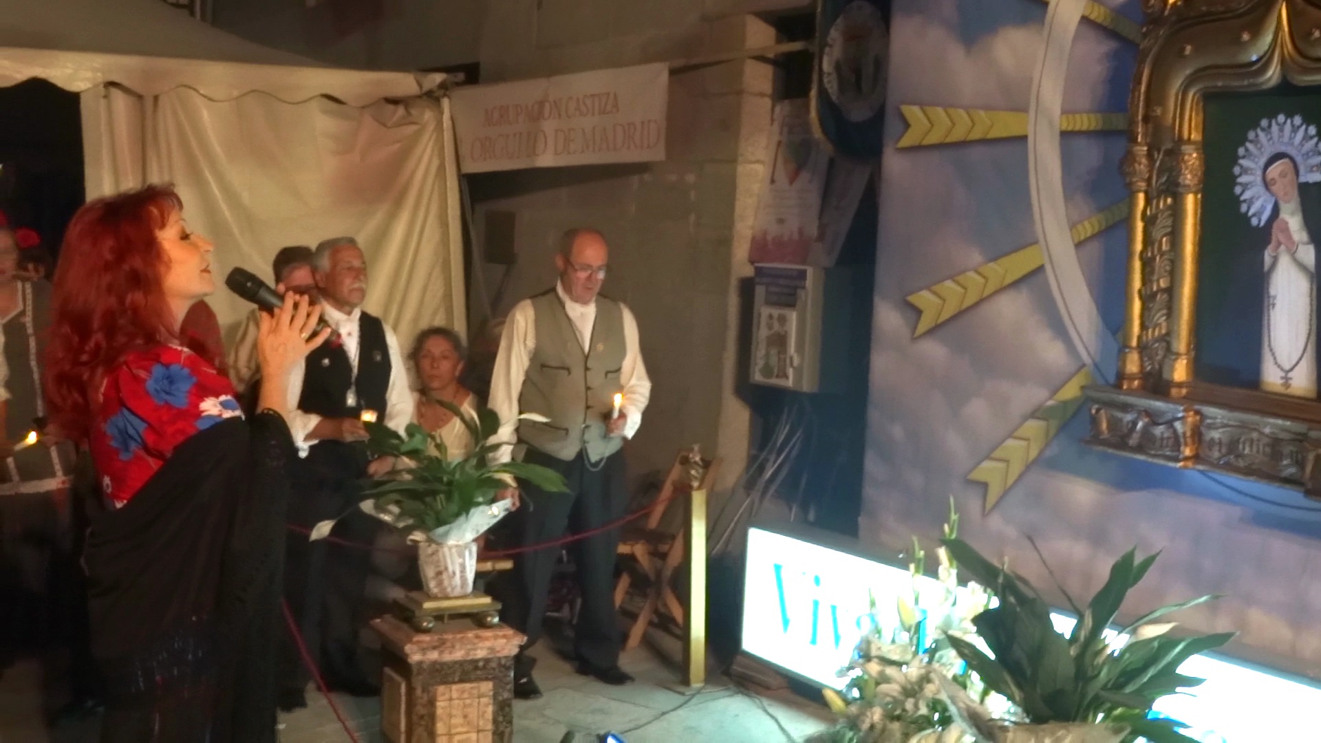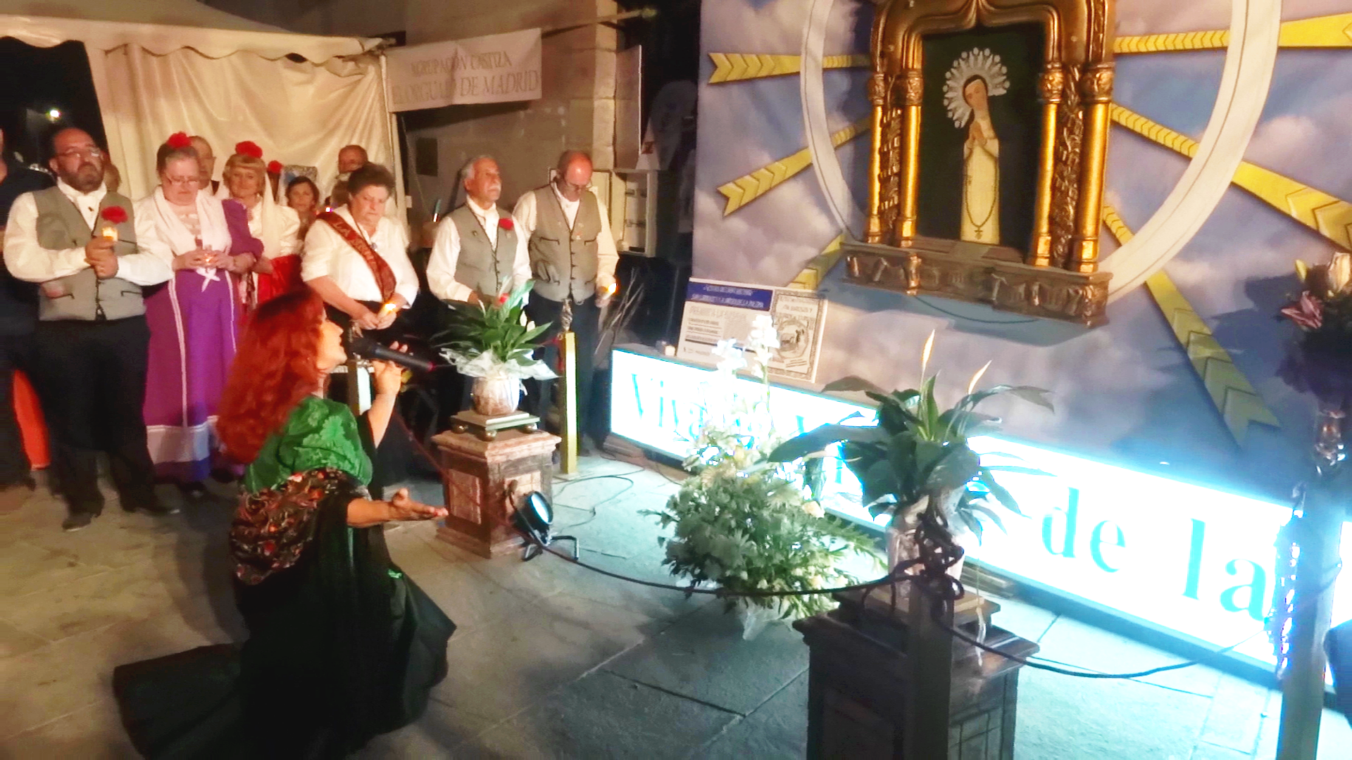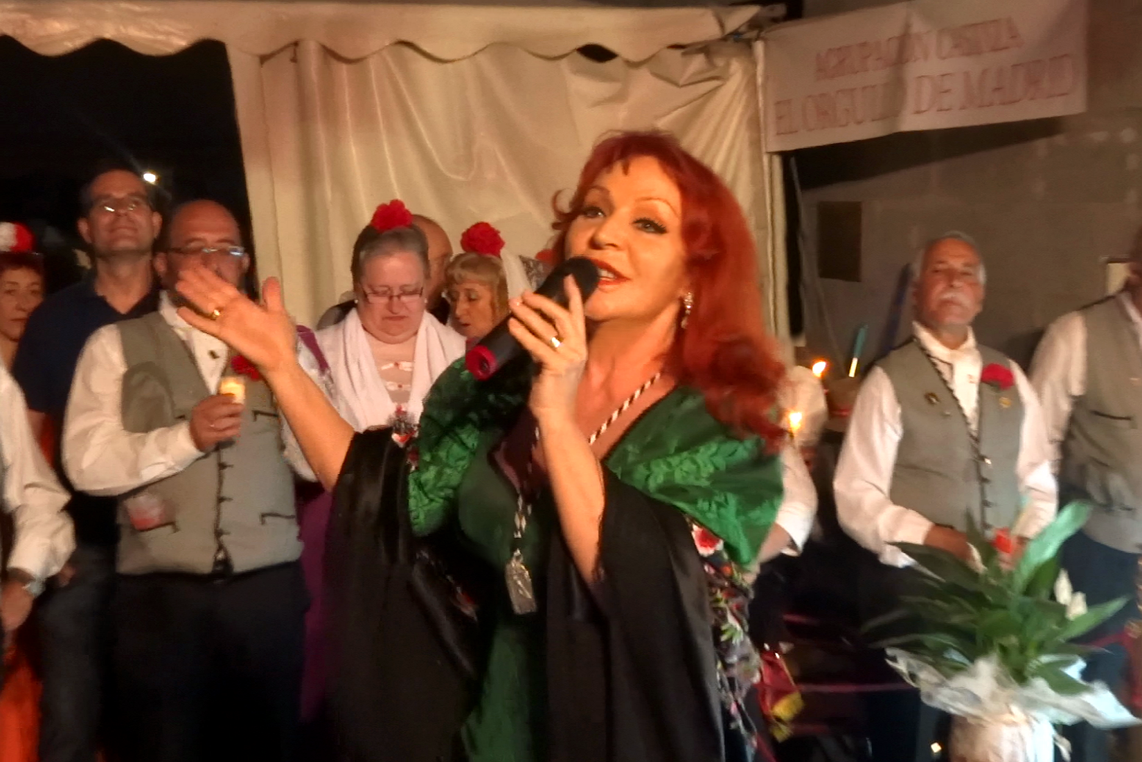A las 12 de la noche, MARI PEPA acudió puntual a la Plaza de la Paja, para cantar la Salve ante el lienzo de la Virgen de la Paloma que expone allí cada año la agrupación castiza «El orgullo de Madrid”.