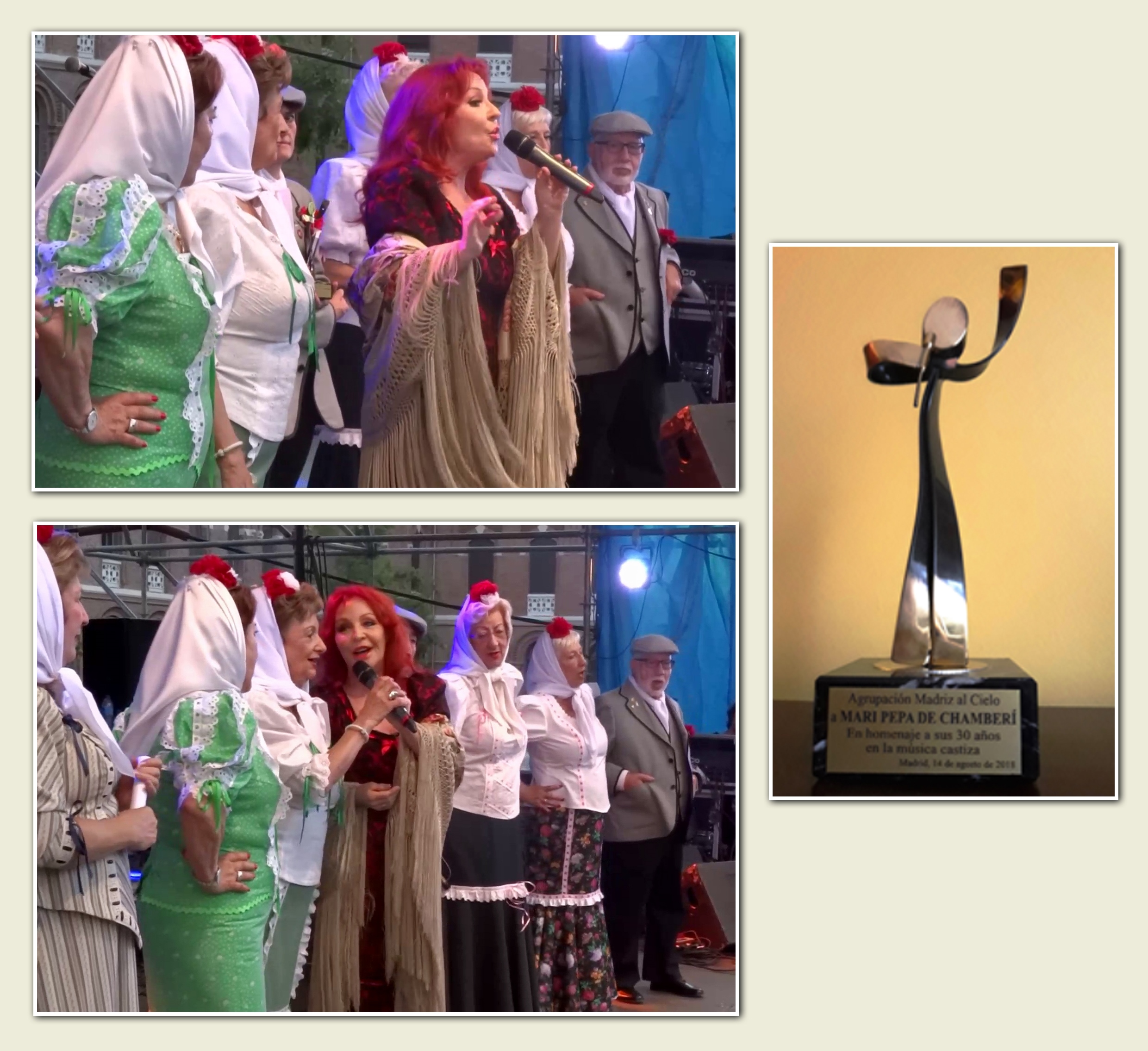 MARI PEPA ha cumplido 30  años dedicada a la música de Madrid y por ese motivo, el 14 de agosto, LA Agrupación Castiza “De Madrid al cielo” le hizo un homenaje y entrega de una placa conmemorativa.