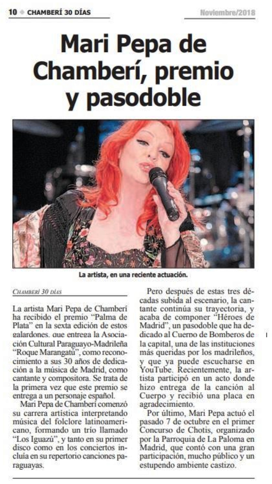 La asociación paraguayo-madrileña “Roque Marangatú” rindió homenaje a Mari Pepa,  por su dedicación durante 30 años a la música de Madrid  como compositora e intérprete y su gran aporte al casticismo madrileño, y en  un acto muy entrañable le fue otorgada la “Palma de plata”.
